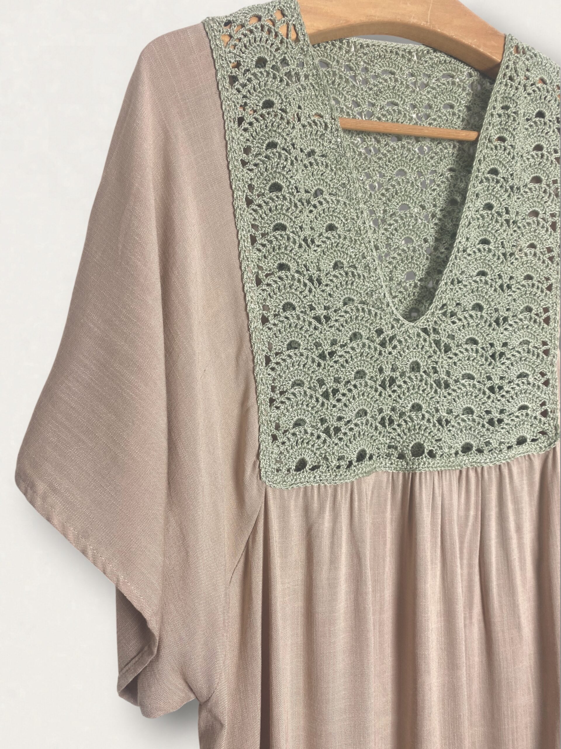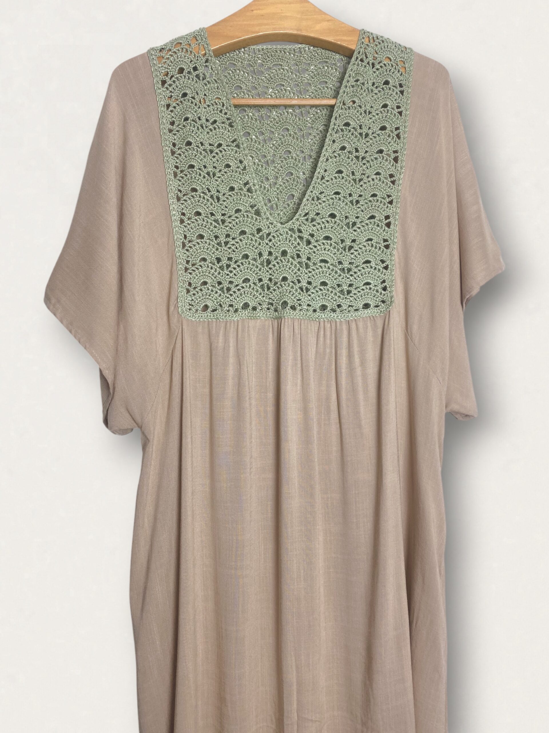 Kaftan longo, soltinho, super confortável, com pala feita à mão em crochê na cor verde menta e tecido em tom de capuccino claro.
